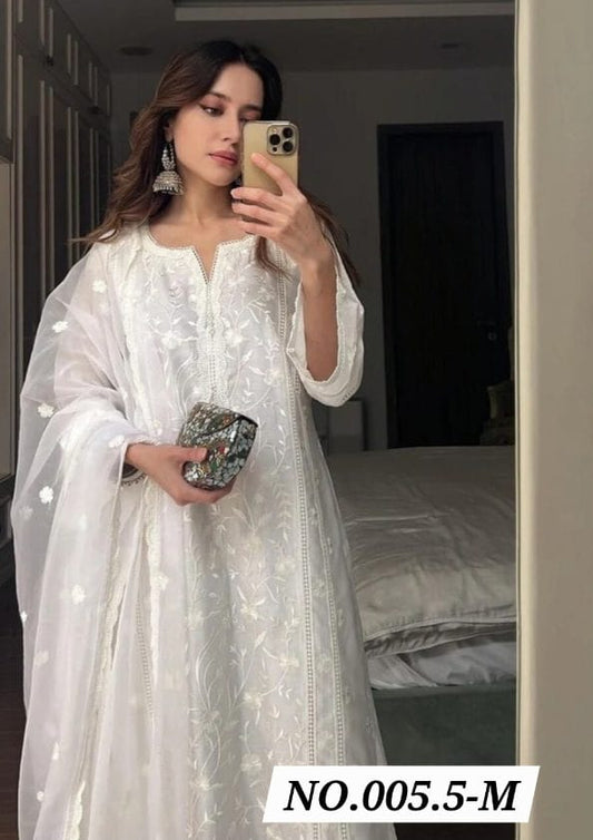 LATEST ORGANZA EMBROIDERY WORK TOP BOTTOM WITH DUPPATTA - WHITE