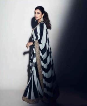 DESIGNER GEORGETTE BLACK AND WHITE PRINT HEAVY LACE BORDER WITH PRE-STITCHED BLOUSE