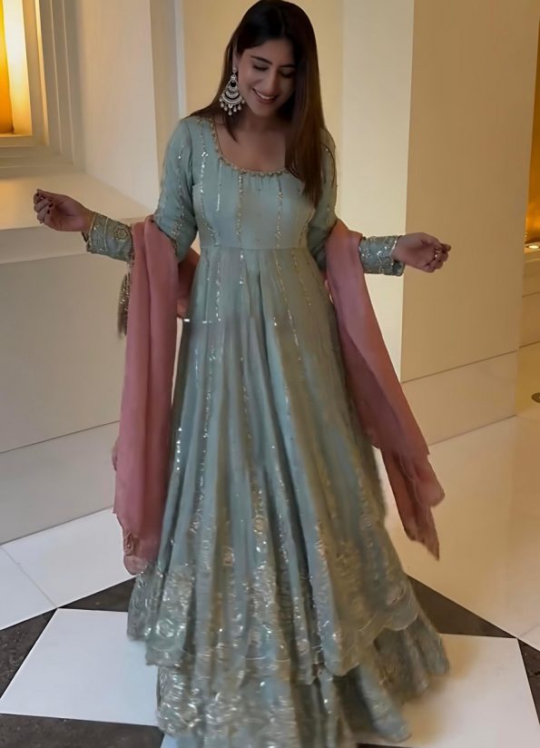 FANCY GEORGETTE EMBROIDERY SEQUENCE WORK TOP LEHENGA WITH DUPPATTA - SKY
