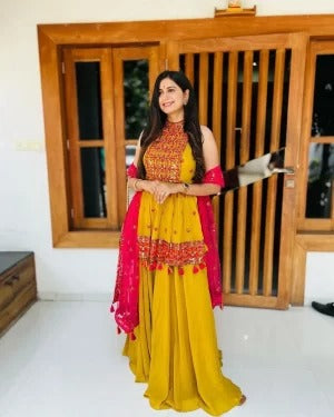 PARTY WEAR MUSTARD SHARARA WITH NET DUPPATTA